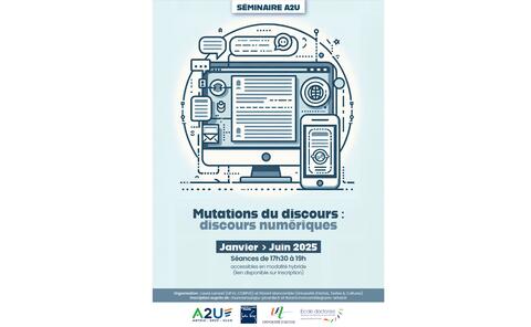 Retour 20janvier 17juin SÉMINAIRE A2U - Mutations du discours : discours numériques Organisation : Laure Lansari (UPJV, CORPUS) et Florent Moncomble (Université d’Artois, Textes & Cultures) Inscription auprès de : @email et @email Séances de 17h30 à 19h, accessibles en modalité hybride (lien disponible sur inscription) Voir le programme Affiche Mutations du discours : discours numériques pdf - 3.53 Mo Partager mail linkedin facebook