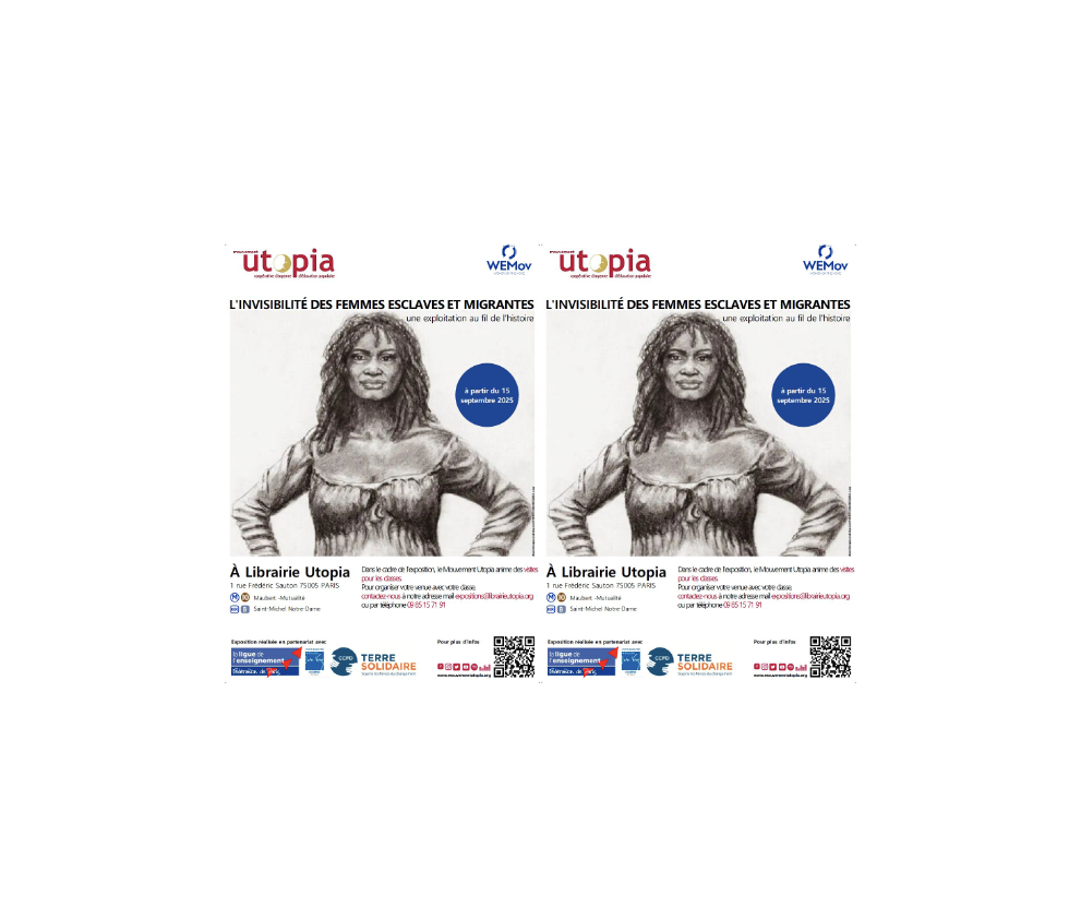 Présentée à la Librairie Utopia (Paris 5ᵉ) jusqu’en mai 2026, cette exposition met en lumière la continuité entre esclavage historique et formes contemporaines d’exploitation, ainsi que les liens entre genre et migration.